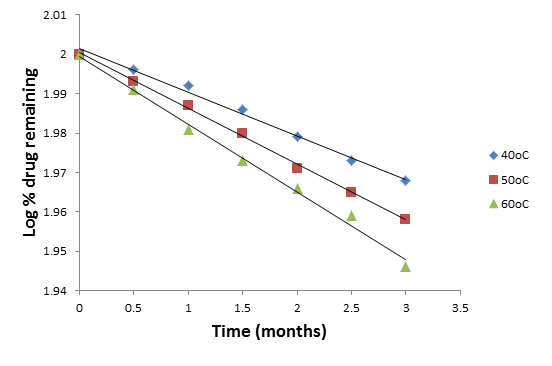 The accelerated expiration data can be calculated using the following equation since the degradation of the drug follow first order kinetics[35]: