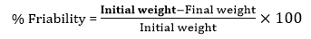 The percentage of friability of tablets should not exceed 1% (w/w) of total weight of tablets to be accepted[11].