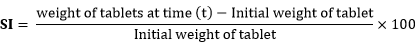 The swelling behavior of a dosage unit was measured by studying its weight gain. The swelling index of tablets was determined by placing the tablets in 100 ml beaker of 0.1NHCL and after 1,2,3,4 and 5 hrs. each, beaker containing tablet with drawn, blotted with tissue paper to remove the excess water and weight on the analytical balance. The swelling index (SI), expressed as a percentage, and was calculated from the following equation[14].