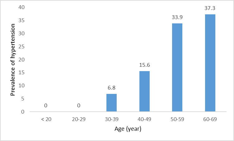 Prevalence of patients with hypertension based on the age groups: 30-39, 40-49, 50-59, and 60-69 y was 6.8%, 15.6%, 33.9%, and 37.3%, respectively.