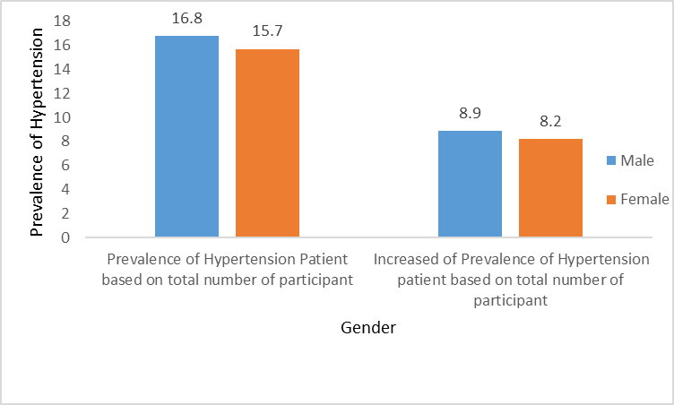 Fig. 2 explained of increased of the prevalence of hypertension patients based on the total number of participants in both villages. Prevalence of patients with hypertension in male was 16.8%, the female was 15.7%, and the total of both were 16.2%. The percentage of hypertension on women is lower than men. The condition is similar with WHO report [2].