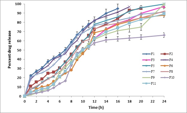 From figure 1 it is evident that formulations F1-F9 released about 90% of drug in 16 to 20 h as compared to F3 formulation which showed controlled drug release up to 24 h. In vitro release data reveals that formulation F10 and F11 released 50.81±2.03 and 83.00±0.16 of drug at the end of 24h respectively. Slower drug release was observed from microparticles prepared at lower speed as compared to higher speed. Formulation F7 F8 and F9 showed no significant change in drug release even though drug concentration was increased.