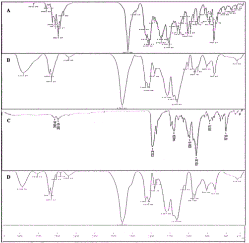 Fig. 2: FTIR spectra of A = drug; B = polymer; C = physical mixture; and D = optimized formulation