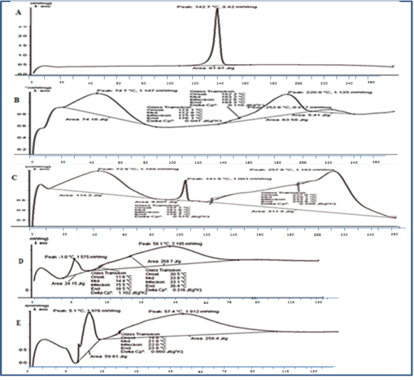 Fig. 3: DSC thermograms of A = drug; B = polymer; C = physical mixture; D = placebo; and E = optimized formulation