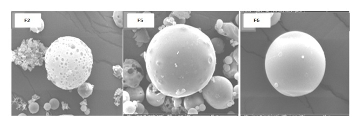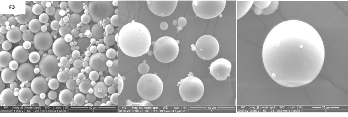 The surface morphology and shape of various formulations was observed by using SEM. An increase in the amount of drug result an increase in surface roughness similarly decrease in polymer concentration also decrease the surface smoothness of microparticles (Figure 5 a). Proportionally increment in surface smoothness was observed by increasing the amount of Eudragit S 100 (Figure 5 b). Higher the polymer concentration more uniform encapsulation would be as compared to less polymer concentration. Higher smoothness and spherosity was observed for F3 (Figure 5b) having drug to polymer ratio 1:5. Scanning electron microscopy of the optimized formulation revealed that Eudragit S 100 microparticles were mostly spherical in shape with smooth outer surface.