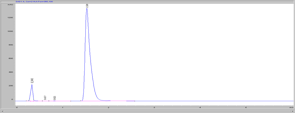 The chromatogram of the afobazole standard solution was obtained by applying above described chromatographic conditions. The specificity and selectivity describe the capacity of the analytical method to measure the drug in the presence of impurities, excipients, degradation products or matrix components. These parameters were determined by comparing the chromatograms of the afobazole standard solution and test solution. The chromatogram of the afobazole standard solution presented a peak in the time retention of 1.5 min (fig. 1). The chromatogram of afb-m solution (test solution) (fig. 2) showed a peak and retention time similar to afobazole standard solution. The components of the microcapsules do not interfere with the analysis; therefore, no peak is observed in the region of the main peak of afobazole (fig. 2). The chromatogram peaks are well resolved, indicating the high specificity of the method.