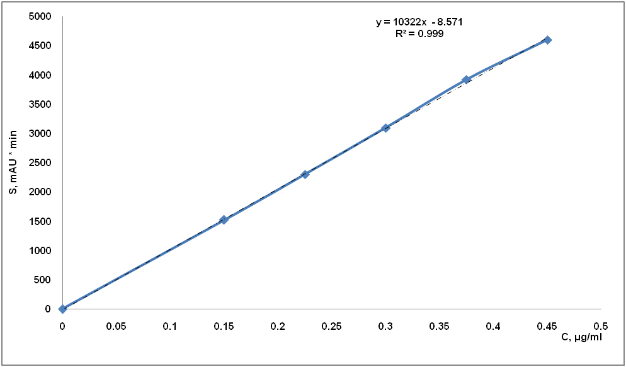 As the shown in fig. 3, the analytical curve for the afobazole standard sample was constructed by plotting the area under the curve (AUC) of the main peak versus drug concentration. It was found to be linear over a wide concentration range (50%-150%) with a correlation coefficient of 0.9996. The straight line (trend line) equation obtained from the experimental results was found to be: y= 10322x-8,5714. The linearity parameters were founded in the experiment corresponds to the all the requirements criteria, the correlation coefficient was more than 0.99, which corresponds to the requirements of the state standard Russia ISO 5725 and ICH Q2 (R1).