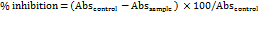 The pellet was collected and washed with phosphate buffer. Various concentrations of ASE and MSE were prepared (50, 100, and 250 µg/ml) using distilled water and to each concentration 1 ml of phosphate buffer, hypo saline and 0.5 ml of HRBC suspension were added. It is incubated at 37 °C for 30 min and centrifuged at 3,000 rpm for 20 min. The haemoglobin content of the supernatant solution was estimated spectrophotometrically at 560 nm. Aspirin (50, 100, 250 µg/ml) was used as the reference standard and a control was also prepared without the extracts. The percentage of HRBC membrane stabilisation can be calculated as follows: