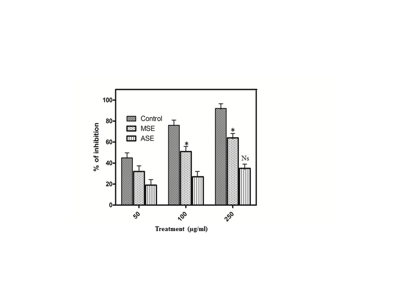 Fig. 2: Percentage inhibition of albumin denaturation activity of C. lanatus seed extracts was determined at various concentrations and compared with the control drug aspirin, (100μg/ml). Values are expressed as mean±SEM and the experiments were done in triplicates, *P<0.05, considered as significant; Ns: not significant versus the control. (ASE: aqueous seed extract; MSE: Methanolic seed extract)