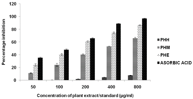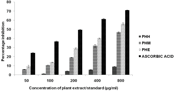 Ethyl acetate extract was the most effective in scavenging the hydroxyl radicals (fig. 3). It exhibited a maximum inhibition of 70.89±1.46 at a concentration of 800 µg/ml. All the extracts studied showed a significant difference in mean percentage inhibition from each other (p<0.001). The maximum level of inhibition by PHM and PHH were 58.33±0.49 % and 8.82±0.85 % respectively. Hydroxyl is considered as a highly damaging radical in free radical pathology. It is capable of damaging almost every molecule in living organisms [26]. The results of the hydroxyl scavenging assay is an indicator of the ability of the extracts to quench the reactive oxygen species (ROS) and the ROS-related chain reactions that may eventually lead to lipid peroxidation, DNA and membrane damages, etc. In the present study, PHE was found to be a promising agent in hydroxyl radical scavenging. Hydroxyl radical scavenging ability of various plant extracts have been reported earlier [27, 28]. Most of the studies correlate this property with the phenolic content of the plants. The present study also suggests a similar effect of plant extracts on hydroxyl radicals. Generation of hydroxyl radicals within the body can lead to lipid peroxidation in biological membranes. The ability of Pyrrosia heterophylla extracts to scavenge hydroxyl radicals can be thus considered as an indicator of its antioxidant activity.