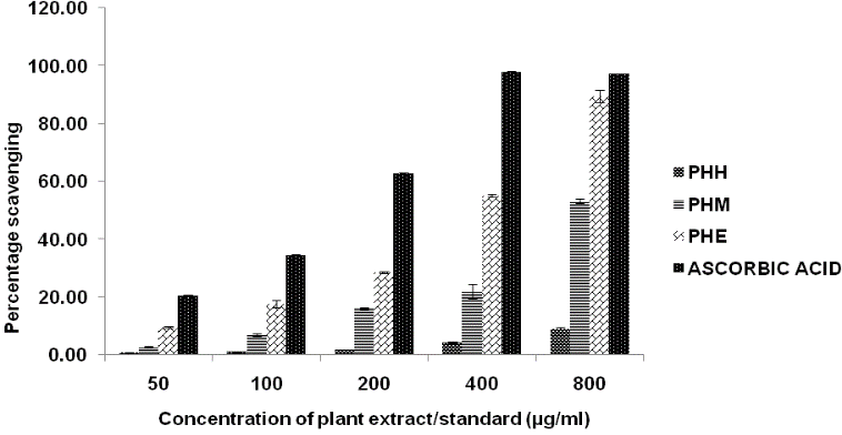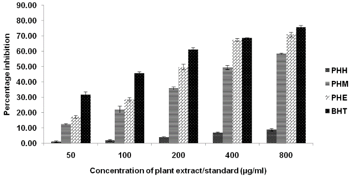 The results of lipid peroxidation inhibition assays indicate the efficiency of the extracts, PHE and PHM, in terminating the chain reaction of lipid peroxidation. This may be due to its ability to scavenge the hydroxyl radicals which have a major role in inducing lipid peroxidation in biological systems [28]. The hydroxyl scavenging activity of the extracts is indicative of the possible protective action against lipid peroxidation.