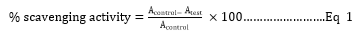 The antioxidant capacity in terms of the ABTS radical scavenging activity was estimated following the procedure described by Delgado-Andrade et al. [14]. Briefly, ABTS●+was obtained by reacting 7 mmol ABTS stock solution with 2.45 mmol potassium persulfate and the mixture was left to stand in the dark at room temperature for 12–16 h before use. The ABTS●+solution was diluted with 5 mmol phosphate-buffered saline (pH 7.4) to an absorbance of 0.70±0.02 at 730 nm. After the addition of 30 μL of sample to 3 ml of diluted ABTS●+solution, the absorbance was measured after 30 min. All samples were analyzed in triplicate. Percentage scavenging ability was calculated as per the equation 1.