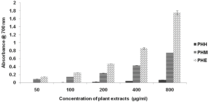 In the reducing power assay, the antioxidant compounds which are capable of donating an electron reduce the Fe3+to Fe2+. Amount of Fe2+complex formed can be monitored by measuring the absorbance of Prussian blue coloured ferric Ferro cyanide, (Fe4[Fe(CN)6]3), at 700 nm. Higher absorbance means the greater activity of the extracts. The highest reducing power was exhibited by PHE, with an absorbance of 1.75±0.05 at 700 nm for 800 μg/ml concentration (fig. 5). Maximum absorbance values of PHM and PHH were 0.74and 0.07 respectively. PHH had very low reducing power. Previous studies have proved that plant extracts containing different phytochemicals display antioxidant activity through their reductive capacity in a Fe3+-Fe2+system [30, 31]. Electron donation capacity is considered as an important mechanism of antioxidant activity of phenolic compounds [32]. The phenolic compounds in the extracts PHE and PHM could be responsible for the reductive potential of these extracts.