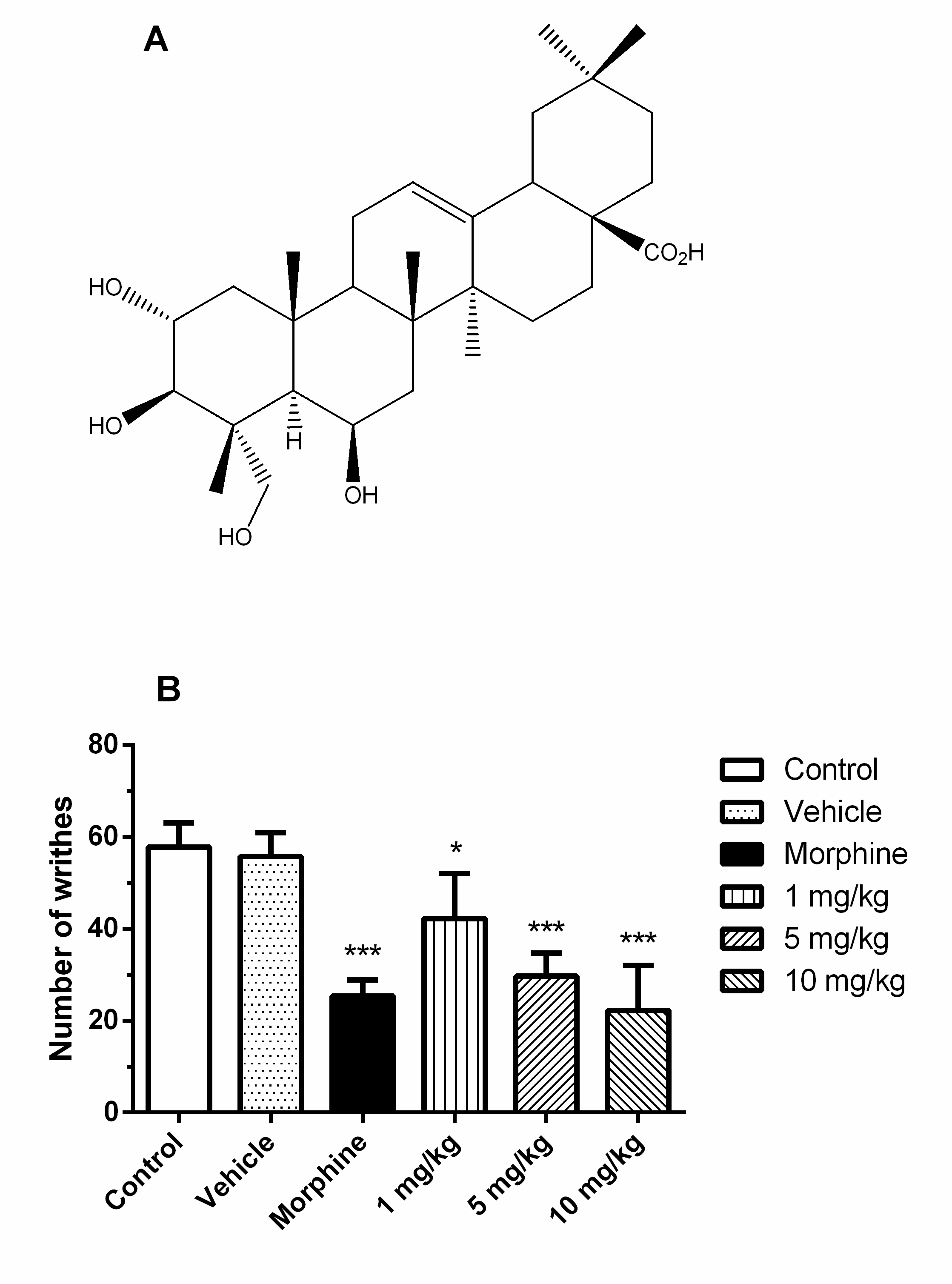Fig. 1: Structure of the 2α-3β-6β-23-tetrahydro-olean-12-en-28-oic acid (A). Effects of orally administered THOA on the acetic acid-induced writhing test (B), Note: The mice were pre-treated with water, vehicle, morphine (5.01 mg/kg) or THOA (1, 5 and 10 mg/kg) 60 min before intraperitoneal injection of acetic acid. The results are expressed as the mean±SEM (n=7-10). The statistical significance was calculated by One-way ANOVA followed by Bonferroni’s test. * p<0.05, ** p<0.01 and *** p<0.001 when comparing the THOA-, vehicle-and morphine-treated groups with the control group