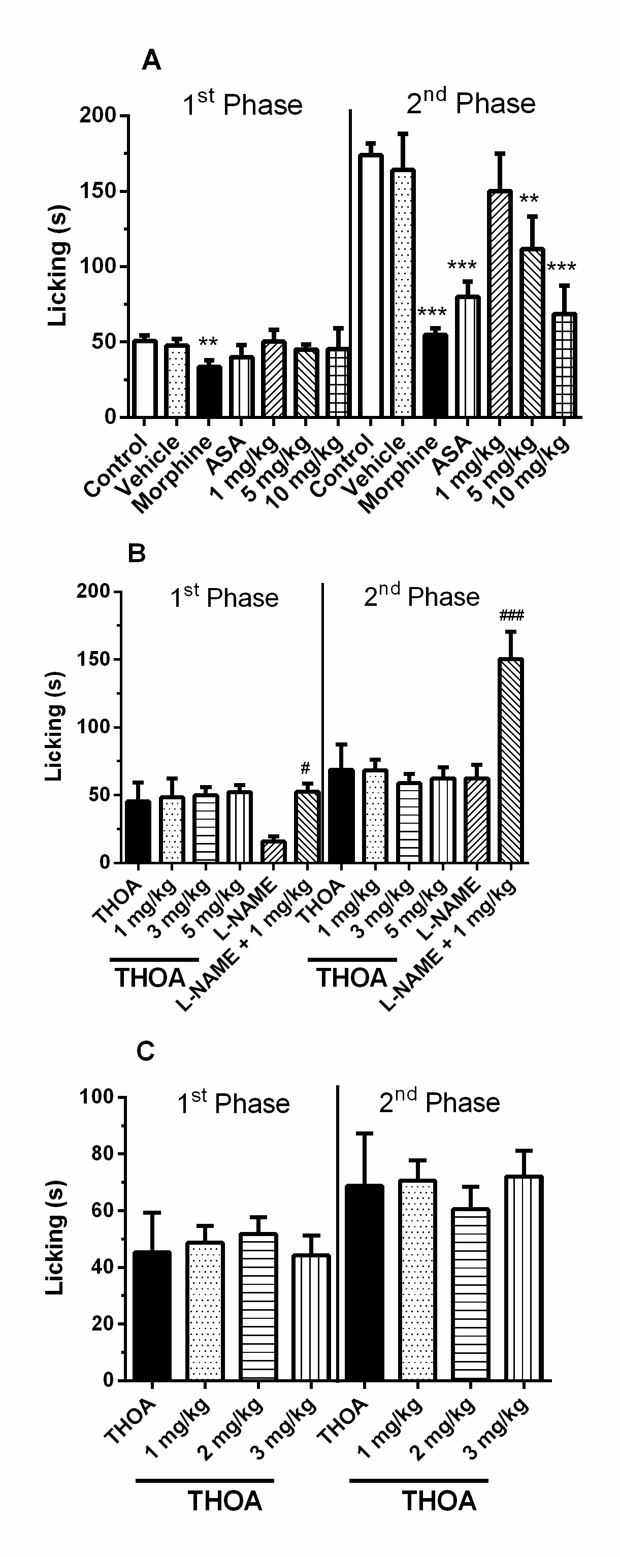 Fig. 2: Evaluation of increasing doses of THOA (A) and evaluation of the dose of antagonists used concurrently with oral administration of THOA in the formalin test (B and C), Note: In B, the mice were pre-treated i. p. with L-arginine (1, 3 and 5 mg/kg) 15 min before the oral administration of THOA or L-NAME. In C, mice were pretreated i. p. with L-NAME (1, 2 and 3 mg/kg) 15 min before injection of THOA. The dose of THOA used was 10 mg/kg, and that of L-NAME was 5 mg/kg. In A, the mice were pretreated with water, vehicle, morphine (5.01 mg/kg), Acetylsalicylic acid (ASA–200 mg/kg) or THOA (1, 5 and 10 mg/kg) 60 min before the formalin injection. The results are expressed as the mean±SEM (n=7-10). The statistical significance was calculated by One-way ANOVA followed by Bonferroni’s test. In A, * p<0.05, ** p<0.01 and *** p<0.001 when comparing the THOA-, vehicle-and morphine-treated groups with the control group. In B, * p<0.05, ** p<0.01 and *** p<0.001 when comparing the group administered THOA alone with the THOA+antagonist-treated groups. # p<0.05, ## p<0.01 and ### p<0.001 when comparing the group administered L-NAME alone with the L-NAME+L-arginine-treated group. In C, ** p<0.01 and *** p<0.001 when comparing the group administered THOA alone with the THOA+antagonist-treated groups