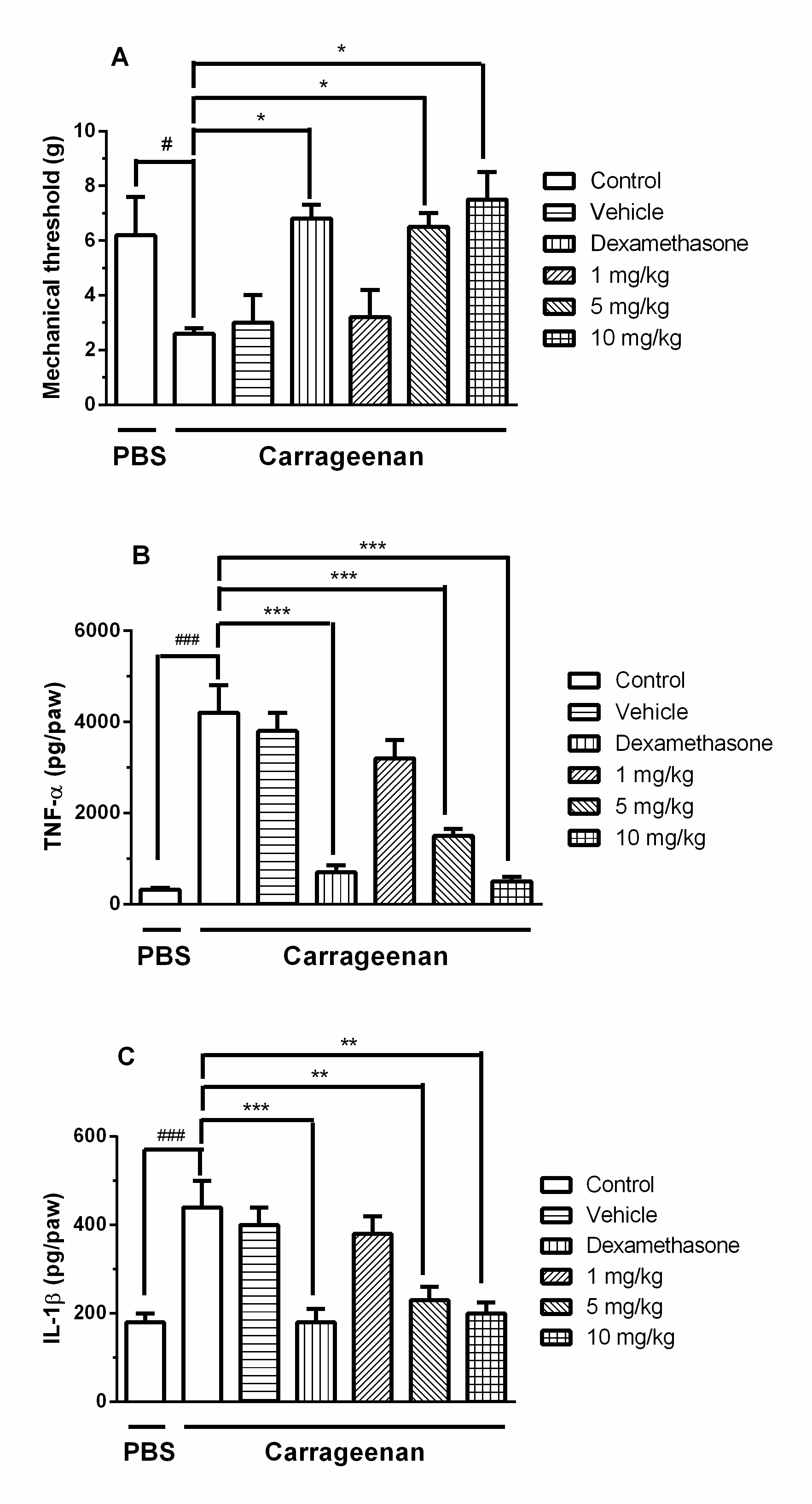 Fig. 3: The effects of orally administered THOA in evaluation of the hyper nociception inflammatory (A) and TNF-α (B) and IL-1β (C) production in the Von Frey test, Note: The mice were treated with water, vehicle, dexamethasone (2.25 mg/kg; s. c.) or the THOA (1, 5 and 10 mg/kg). PBS or carrageenan was applied in the paws of the animals. The results are expressed as the mean±SEM (n=7-10). The statistical significance was calculated by One-way ANOVA followed by Bonferroni’s test. * p<0.05, ** p<0.01 and *** p<0.001 when comparing the THOA-, vehicle-and dexamethasone-treated groups with the carrageenan-control group. # p<0.05, ## p<0.01 and ### p<0.001 when comparing carrageenan-control group with the PBS-control group