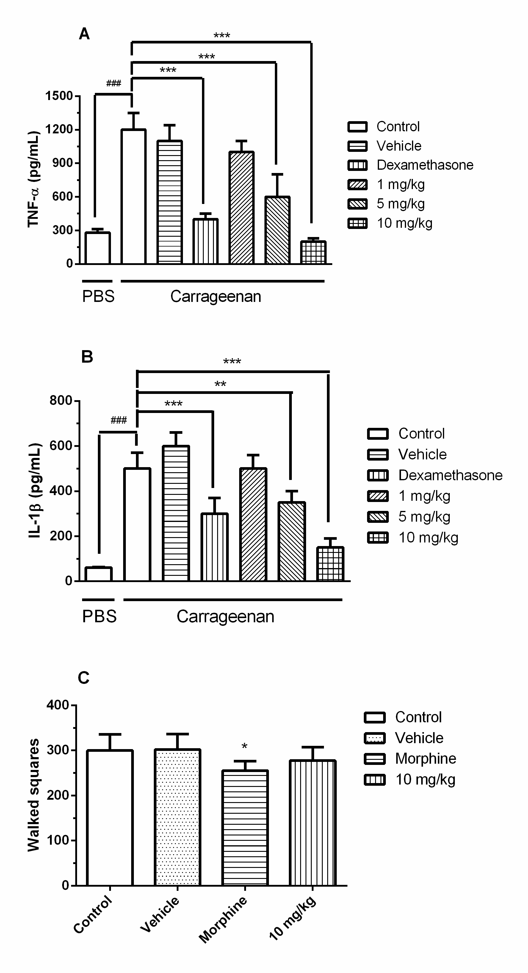 Fig. 4: The effects of orally administered THOA on TNF-α (A) and IL-1β (B) production in the Air-pouch test and effect of THOA in the Open field test (C), Note: The mice were treated with water, vehicle, dexamethasone (2.25 mg/kg; s. c.) or the THOA (1, 5 and 10 mg/kg) (A and B). The mice were treated with THOA (10 mg/kg), morphine (5.01 mg/kg), water or vehicle and 60 min later the animals were placed in the observation chamber (C). PBS or carrageenan was applied in the pouch of the animals. The results are expressed as the mean±SEM (n=7-10). The statistical significance was calculated by One-way ANOVA followed by Bonferroni’s test. * p<0.05, ** p<0.01 and *** p<0.001 when comparing the THOA-, vehicle-and dexamethasone-treated groups with the carrageenan-control group. # p<0.05, ## p<0.01 and ### p<0.001 when comparing carrageenan-control group with the PBS-control group (A and B). * p<0.05, ** p<0.01 and *** p<0.001 when comparing the THOA-, vehicle-and morphine-treated group with the control group (C)