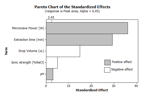 According to the Pareto chart, pH exhibited a positive little significant effect. The ionisation form of the extracts changed with the modification of pH, affecting their water solubility and extractability. In this study, the effect of pH was investigated by varying the pH from 4.0 to 7.0 only. It has been known that decomposition of organophosphate pesticides, causes reduction of extraction efficiency at high pH levels. Therefore, the original unadjusted pH 7 sample was chosen for further experiments.
