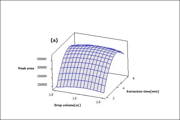 Drop volume is the next significant variable, which exhibits a negative effect. Results showed that the peak areas decreased with increasing drop volume; which is agreeable to a previous report [19]. In general, an increase in the signal peak area is expected on increasing drop volume. However, the bigger organic solvent drop is required for extending equilibration time because mass transfer inside the drop is by diffusion alone, representing a slower extraction procedure.
