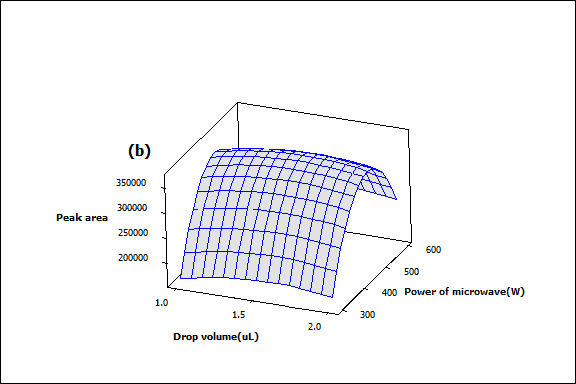 Where Yั is the peak area of chlorpyrifos, X1 is drop volume (µl), X2 is extraction time (min) and X3 is a power of microwave (W). For the quadratic models, the optimization condition could be calculated.