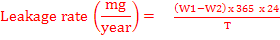 Indiscriminately twelve canisters were selected and date and time was recorded by rounding to the nearest half hour. Every canister was weighed in milligram and noted as W1. Then canister was kept in invert position in room temperature for 3 days and weighed again and recorded as W2 after recording of date and time by rounding to the nearest half hour. Time was determined as T hours. According to specification the average leakage rate should not be more than 525mg/year and for a single canister should be less than 750mg/year in case of 15gram net weight of canister. But for a single canister if the leakage is more than 750mg/year and lesser equal to 1.1gram/year, the test should be repeat for another 24 container in addition with the previous 12 container and again to pass this test less or equal to 2 containers may leak 750mg/year out of 36 and not even a single should leak more than 1.1gram/year.