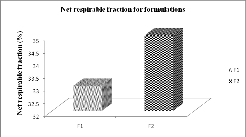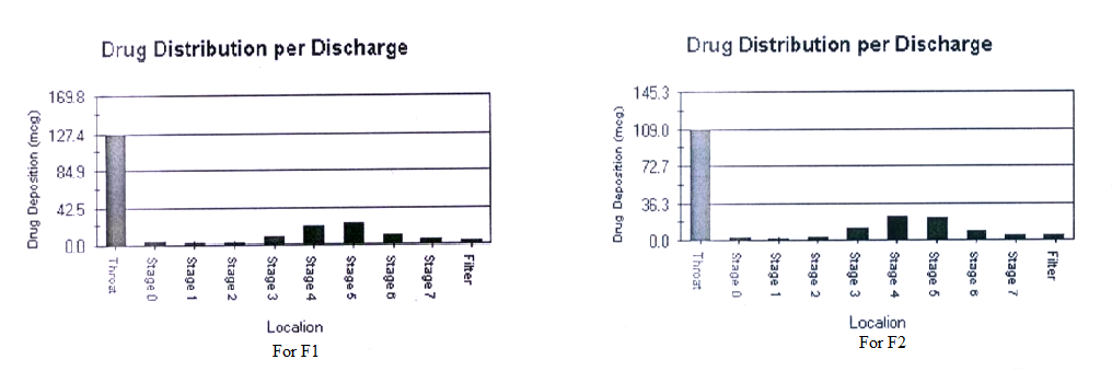 Therapeutic action of MDI is administered by the deposition of emitted dose in terms of particle size distribution. From the analysis of data, Fine Particle Dose was found 74.9020mcg for formulation F2 which was higher than F2 i.e. 72.3600mcg and similarly the Fine Particle Fraction was found higher in F2 (39.64%) than F1 (35.16%).