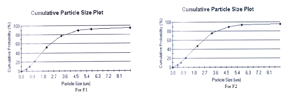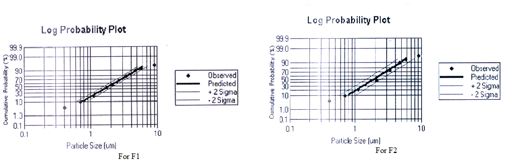 Mass Median Aerodynamic Diameter of particle F2 formulation was found little higher (1.9346μm) than F1 (1.9054μm).In both the formulations Geometric Standard Diameter of particle was found bellow 3μm in diameter but F2 formulation Geometric Standard Diameter of particle was found little higher (2.1280μm ) than F1 (2.0839μm) ( Table 3, Figure 1, Figure 2, Figure3). So, formulation F2 would provide better pulmonary deposition as compared to F2.