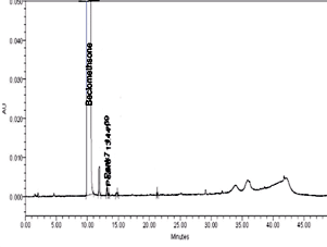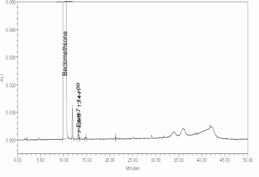 Drug content of Beclometasone Dipropionate MDI was investigated by HPLC (Jasco, Japan) with the help of Chrompass software using HiQ Sil C18HSm (150 mm X 4.6 mm, particle size of 5 μm) reverse phase chromatographic column. The MDI was inverted and kept in a glass beaker which contained Acetonitrile (HPLC grade) and water (Mili Q or equivalent) in 60:40 ratios, after shaking the MDI for 30 min. A quantity of spray equivalent to 2.5mg of Beclomethaone dipropionate (10sprays at 15 sec intervals) was dissolved in the mobile phase and dilution was done to 250 ml using the mobile phase then passed through 0.45μm nylon filter and applied with a floe rate of 1 ml/ min for 10 min. Absorbance was measured at 254 nm.