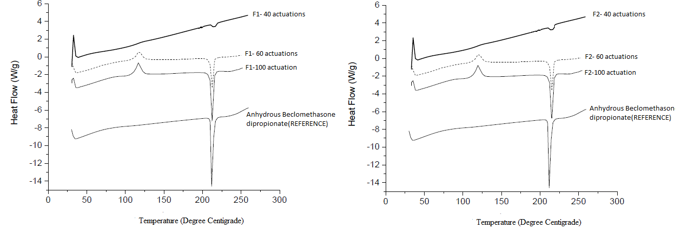 The material collected from the formulated both Beclometasone dipropionate metered dose inhalers was not found any thermal transition in comparison to the reference melt endothem but a large endothermic peak was found at an onset of 1500C (F1) and 1510C (F2) with no exothermic peak. No melt endothermic peak signified that no crystalline amorphous form was found when sample was collected from Beclometasone dipropionate MDI.