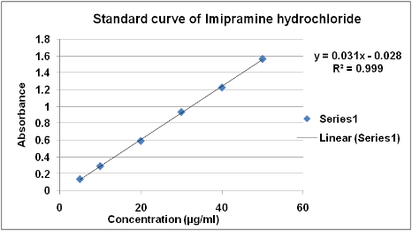 In this study, we follow the method given by Jadhav SB et al.,[19] with slide modification [19]. A total of 10 mg of an accurately weighed quantity of imipramine hydrochloride was dissolved in 100 ml of methanol (100µg/ml). From the above stock solution, 50 ml was taken and diluted with methanol to make it 100 ml to get the concentration of 50µg/ml. In order to generate a calibration curve, 5µg/ml, 10µg/ml, 20µg/ml, 30µg/ml, 40µg/ml, 50µg/ml, of the primary standard were prepared and the calibration curve was obtained by measuring their absorbance at predetermined UV-VIS spectrophotometer at 251 nm. The volumetric flask was first wrapped with black paper and then it was covered with aluminium foil to avoid the problem of drug photosensitivity.