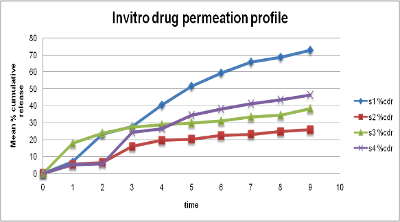The regression analysis of the in vitro permeation curves was carried out for in vitro permeation studies in rat skin. Among all these formulations, the formulation F-1 showed the maximum % drug cumulative release i.e. 84.71 % up to 24 h of the study. All the formulations showed Higuchi-type release kinetics. Regression analyses of the in vitro permeation curves were carried out.