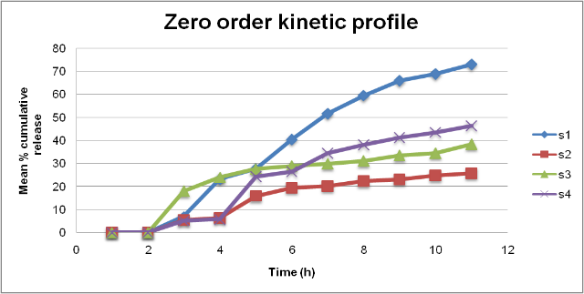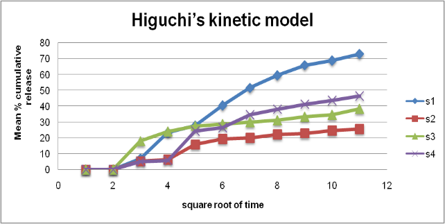 The in vitro release data were fitted to models representing zero-order, first-order, and Higuchi’s square root of time to determine the correlation coefficient, slope, and intercepts values. From the values of the correlation coefficients, the best-fitted data can be predicted. The curve fitting of the release data was carried out mainly by regression analysis [20]. The maximum correlation coefficient has been considered statistical parameter to designate the function with the best fit to the data [21]. The inspection of correlation coefficient values showed that the drug release followed the diffusion control mechanism from the patches [22-23]. The study of Jadhav SB [19] et al., (2014) showed that the stability studies were carried out at 25 °C/60% RH for the selected formulation up to 30 d. in the duration of stability study time interval, the tablets were analyzed for drug hardness, in vitro disintegration time, % drug release up to 30 d. These formulations show not much difference in any parameter. This study was concluded that the formulation was stable and retained their original properties [19].