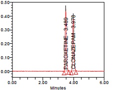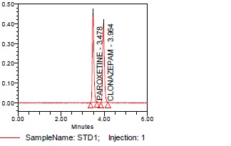 System suitability was determined before sample analysis from duplicate injections of the standard solutions of paroxetine and clonazepam.The column efficiency, resolution and peak asymmetry were calculated for the standard solutions. Resolution between paroxetine and clonazepam peaks was found to be 3.361. USP tailing (Peak Asymmetry) for paroxetine and clonazepam were found to be 1.246 and 1.196 respectively. Number of theoretical plates (USP plate count) for paroxetine and clonazepam were found to be 10704 and 11407 respectively.