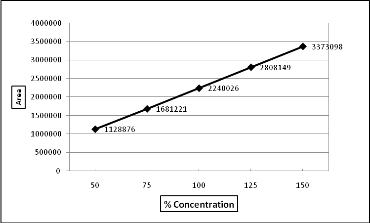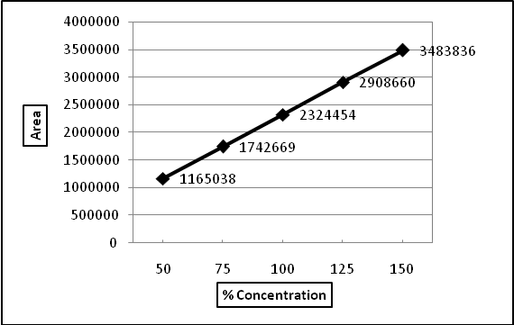 The linearity of the method was determined at five concentration levels (50%, 75%, 100%, 125% and 150%). Linearity test solutions were prepared by diluting the stock solutions to the required concentrations. The calibration curves were plotted between the responses of peak area versus concentration of analyte. The slope and intercept value for calibration curve was y = 16616 x (r2=0.99) for paroxetine and y = 19288 x (r2=0.99) for clonazepam. The result (Table V) shows that an excellent correlation exists between areas and concentration of drugs within the concentration range. Calibration curves are presented in Figure III.