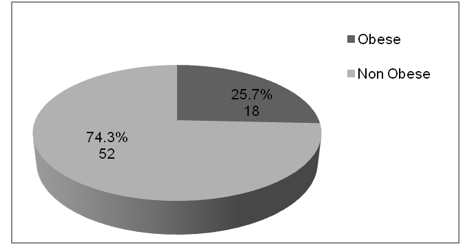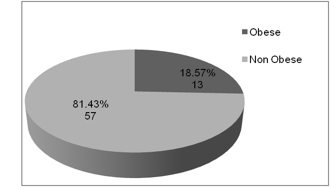 Results: Among men, the prevalence of underweight was 9.5%, normal weight 57.1%, overweight 14.3% and obesity 19.1%, while among women, the prevalence of underweight was 12.2%, normal weight 53.1%, overweight 14.3% and obesity 20.4%. Overall, 18 (25.7%) was obese and 52 (74.3%) was non-obese while sex specific WC in cm 19 (27.1%) was abdominal obese who were at risk of metabolic complication associated with obesity and 51 (72.9%) was not at risk. In chi-square association tests revealed that among respondents, currently married, unemployed and having family history with obesity were associated with generalized obesity while respondents who were currently married and having fast food frequently were associated with abdominal obesity and respondents who being currently married, unemployed and having fast food frequently were more likely to obese in generalized as well as abdominally.
