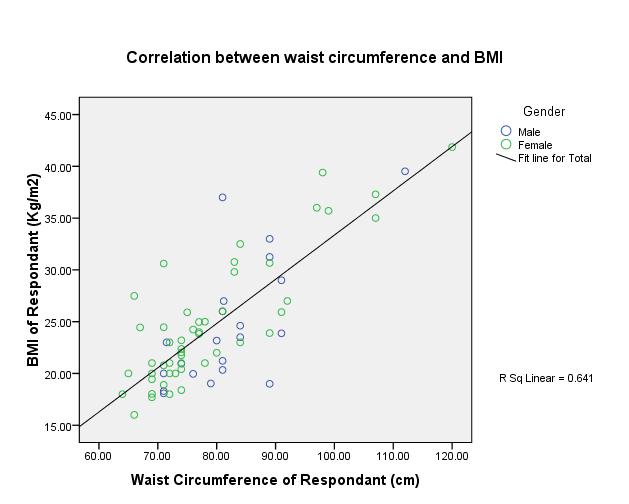 There was a strong (r=0.64) and significant (p<0.001) correlation between WC and BMI as shown in fig. 4 means that the more WC had the higher BMI.