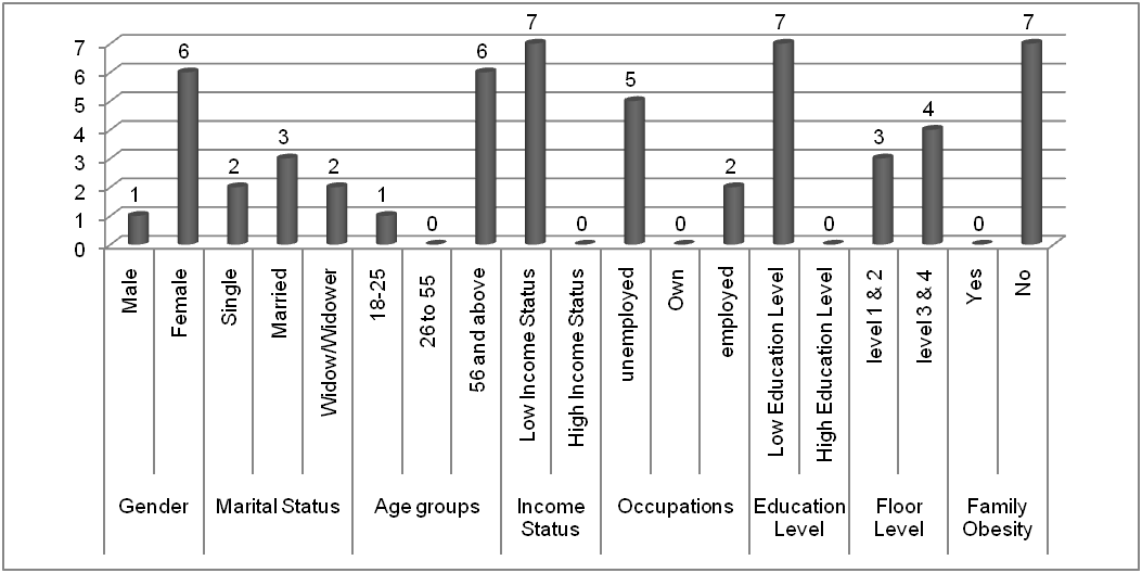 Fig. 5 and 6 showed the socio-demographic characteristics and selected associated factors of abdominal obese respondents who had normal BMI. It was detected that seven out of nine (36.84%) of respondents who were abdominal obese people with normal BMI. The populations with normal BMI but with abdominal obesity are most of the time the ‘neglected’ population in terms of health interventions. Findings revealed that majority 80% over were being female, married, 56 y and above aged, come from low income family, unemployed, low education status, living at the flat with low high floor level and they don’t have obese family members. Almost all abdominal obese people were practicing unhealthy dietary pattern in terms of not eating standard healthy plate per meal, having fast food frequently and consuming sweet drinks between meals, physical inactive, satisfied sleep pattern and having low level of knowledge and attitude towards obesity.