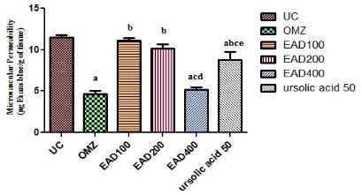 Fig. 3: Effects of EAD, ursolic acid and omeprazole on microvascular permeability in gastric mucosa induced by absolute ethanol