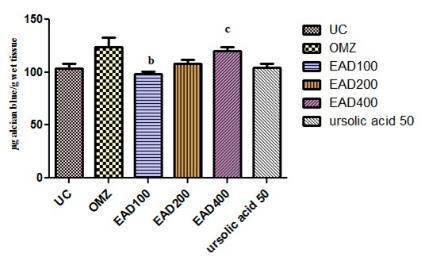 EAD 400 mg/kg, p. o., ursolic acid (50 mg/kg, p. o.) and omeprazole (20 mg/kg., p. o.) showed significant action on microvascular permeability in gastric mucosa induced by absolute ethanol as shown in fig. 3. The extrasavated amount of Evans blue dye in the gastric mucosa was decreased in these treated groups as compared to the ulcerated control group (54.83, 23.49, and 59.35%), respectively.