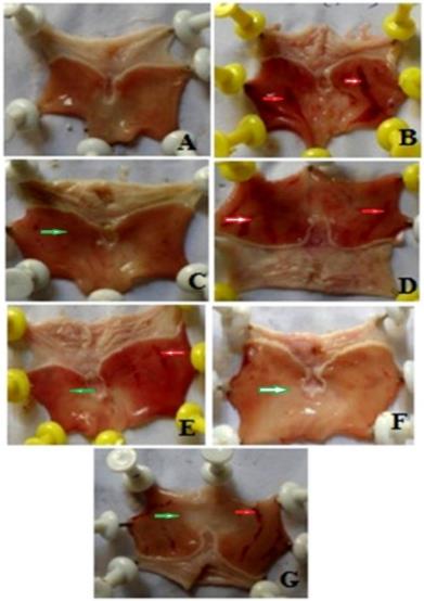 (A) Normal control (B) ulcer control (C) Omeprazole (20 mg/kg) pretreated group (D-F) Pretreated EAD doses at 100, 200 and 400 mg/kg (G) Ursolic acid (50 mg/kg, p. o.). ((Indications of arrow marks: Red: Gastric pit lesions formation; Green: stomach normal architecture with less or no ulcer formation).
