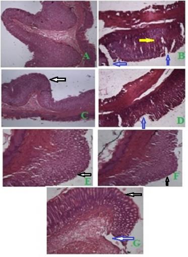 Fig. 6: Histological evaluations for the protective effect of EAD and ursolic acid, (A) Normal control (B) ulcer control (C) Omeprazole (20 mg/kg) pretreated group (D-F) Pretreated EAD doses at 100, 200 and 400 mg/kg (G) Ursolic acid (50 mg/kg, p. o.) on ethanol-induced gastric damage in rat stomach tissues.(Indications of arrow marks: Blue: Severe surface epithelium detachment; Yellow: haemorrhage, Black: stomach normal architecture with less or no ulcer formation)
