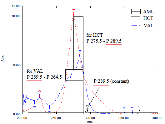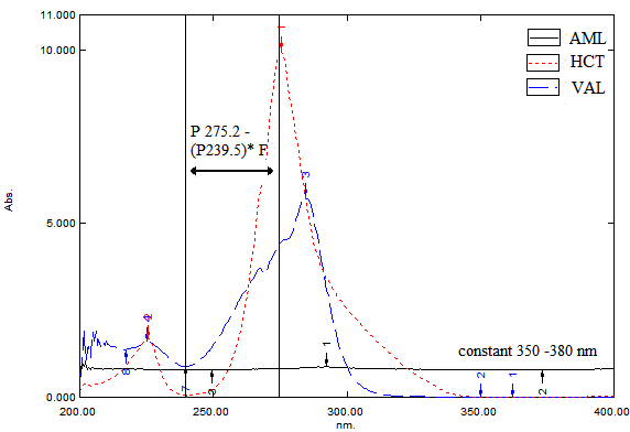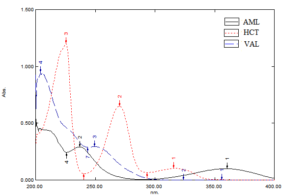 Aliquots equivalent to (4−36 μg/ml), (2−42 μg/ml) and (2−20 μg/ml) of AML, VAL and HCT were prepared separately in a solvent mixture of methanol: water (50:50 v/v). The absorption spectra of the prepared solutions were measured at (200 − 400 nm) and stored in the computer.