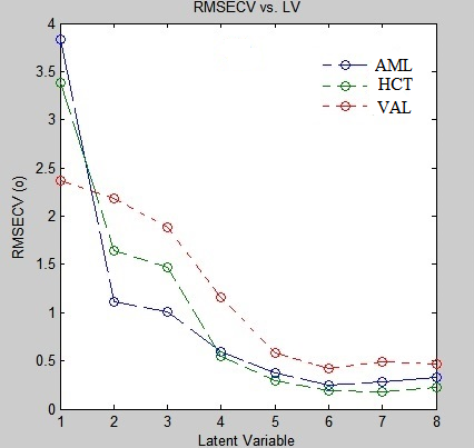 Fig. 5: RMSECV of the calibration set of AML, HCT and VAL as a function of latent variables