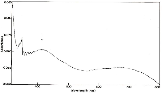 UV–Visible spectroscopy is an important technique to determine the formation and stability of metal nanoparticles in an aqueous solution. The extracellular synthesis of silver nanoparticles using S. fusiformis involved by the reduction of Ag+ions was identified by the UV-Visible spectroscopy. The characteristic absorption peak observed at 450 nm in UV–Visible spectrum for S. fusiformis (Fig. 2) indicated the formation of AgNPs.