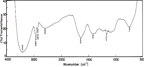 The FT-IR spectrum recorded for silver nanoparticles synthesized using S. fusiformis biomass, showed a variation in the intensity of bands in different regions (Table 1). A number of broad bands were observed in the region of 3907, 3779, 3410, 2927, 2853, 2593, 1644, 1416, 1170 and 749 cm-1 (Fig. 3).