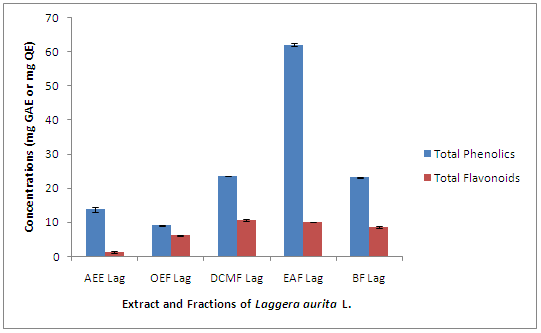 The total phenolics content per 100 mg of laggera aurita L. extract and fractions ranged from 62.12±0.68mgGAE to 9.07±0.17mgGAE. The highest content of total phenolics was detected in EAF with 62.12±0.68mgGAE following by DCMF with 23.67±0.05mgGAE. The lowest total phenolics were obtained in OEF with respectively 9.07±0.17mgGAE.