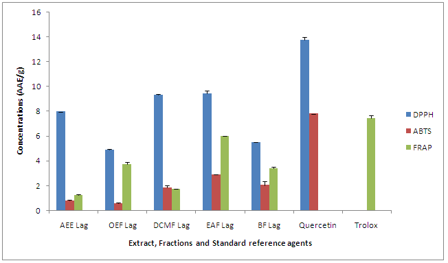 Results: Estimation of Total phenolic and flavonoids contents revealed that EAF and DCMF have the highest phenolic and flavonoid contents 62.12±0.68mgGAE and 10.56±0.29mgQE respectively. These results indicated that most of the bioactive fractions from Laggera aurita L. were able to inhibit Gram-positive bacteria as compared to Gram-negative bacteria. Among the samples tested for antioxidant activities, EAE and DCMF have the highest activities compared to other fractions.