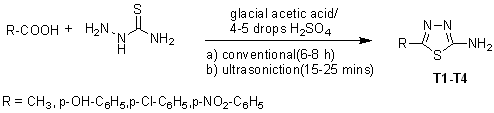 2-substituted-5-amino-thiadiazoles was synthesised accordance to the literature reported procedure [21] and by an alternative greener method, ultra sonication in which pleasing similar outcomes was found. The progress of the reaction was monitored by TLC plates.