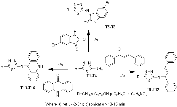 Synthesis of substituted thiadiazole schiff’s bases (T5-T16) by conventional/ultra-sonication method