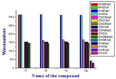 Fig. 2: Experimental and computed wave numbers of the T1, T9, T30 compound